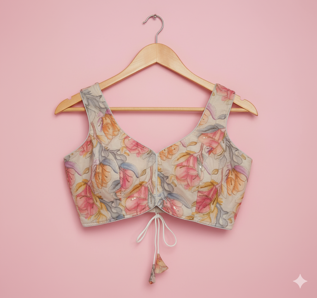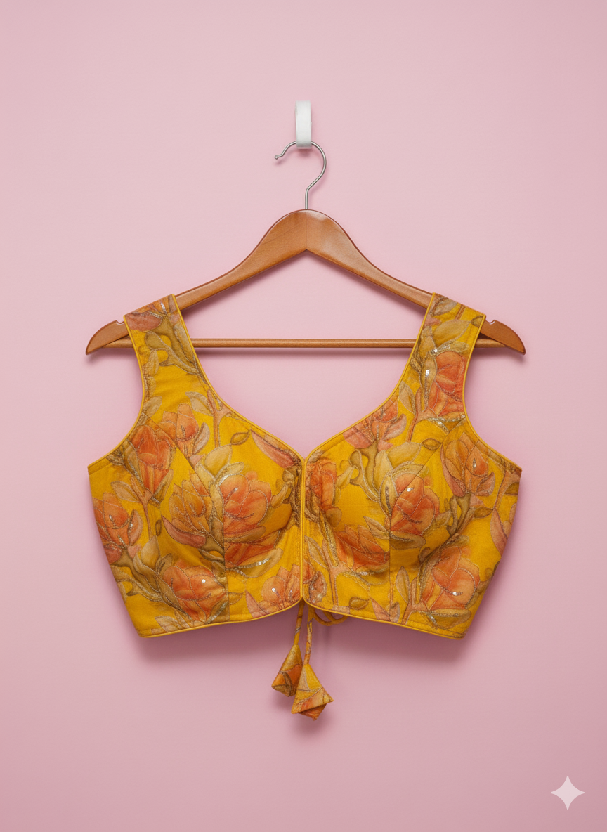 Stay on-trend with the blouse’s stylish front-tie design that adds a flattering silhouette to your outfit. The vibrant floral patterns breathe life into any ensemble, making it an ideal pairing with sarees for a traditional yet modern look. With a size of 38 and a ready margin extending up to 42, this blouse is tailored to fit comfortably while ensuring effortless aesthetic appeal for women of varying preferences.