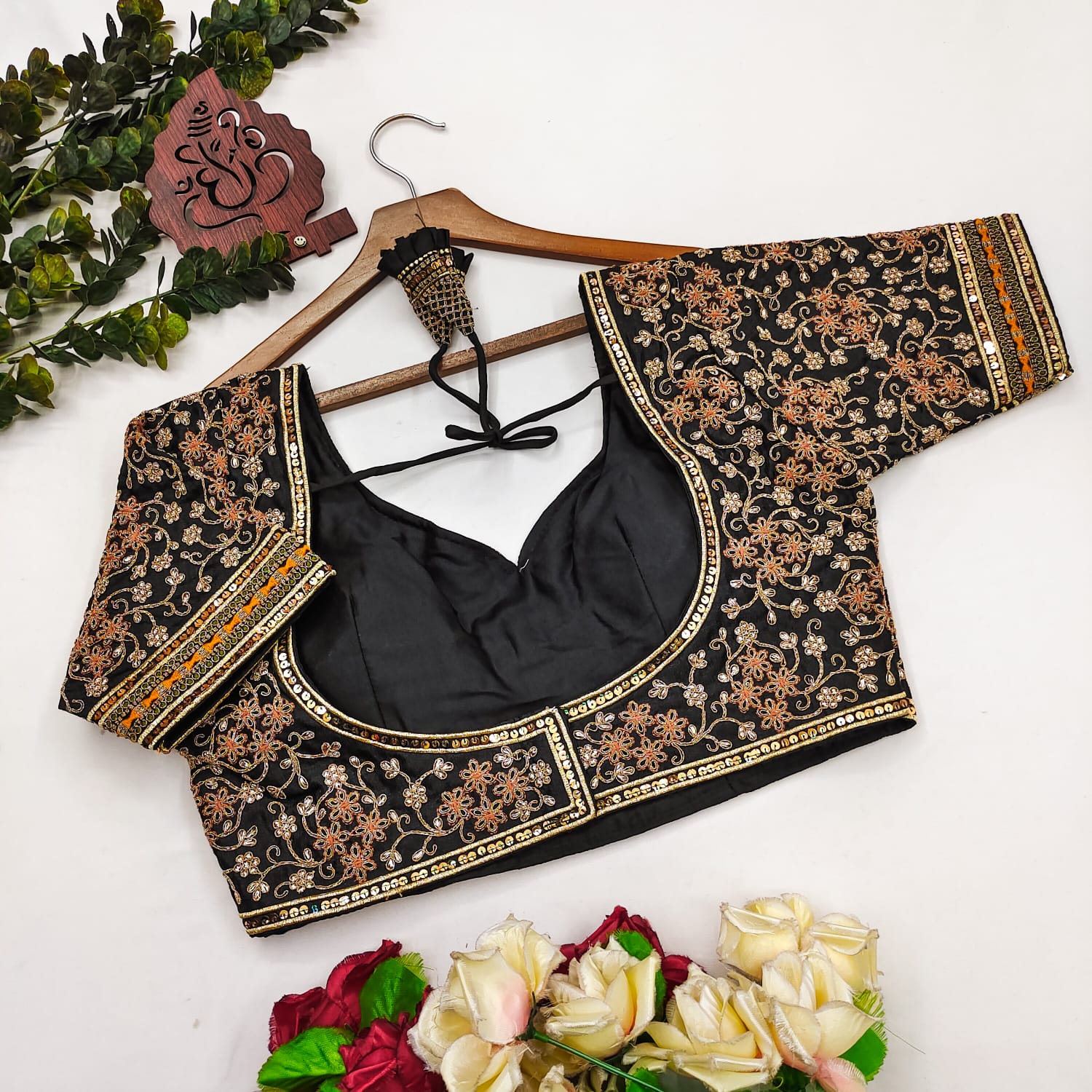 For a soft and ethereal look, this light beige blouse is perfect for day weddings or receptions. The delicate shade, adorned with golden accents, brings out a gentle, luminous charm.